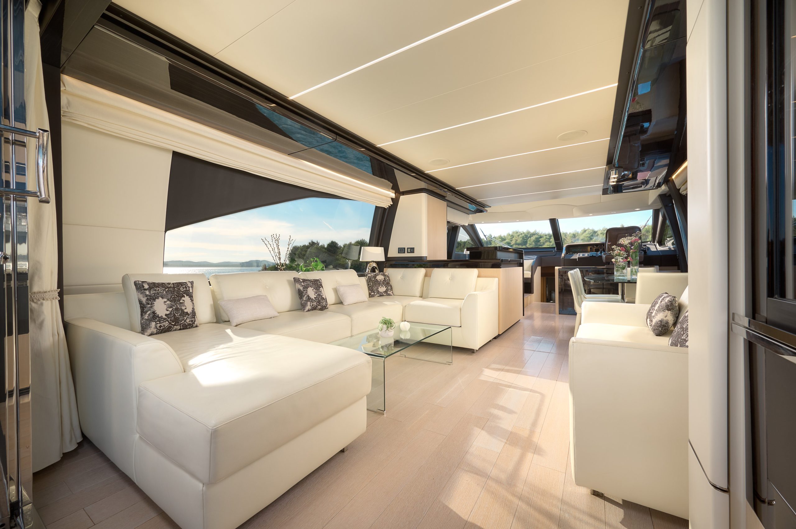 Outdoor areas are a standout feature, with multiple lounging and dining spaces across the flybridge, aft deck, and foredeck. A swim platform allows easy access to the sea, making swimming and water activities simple and enjoyable.