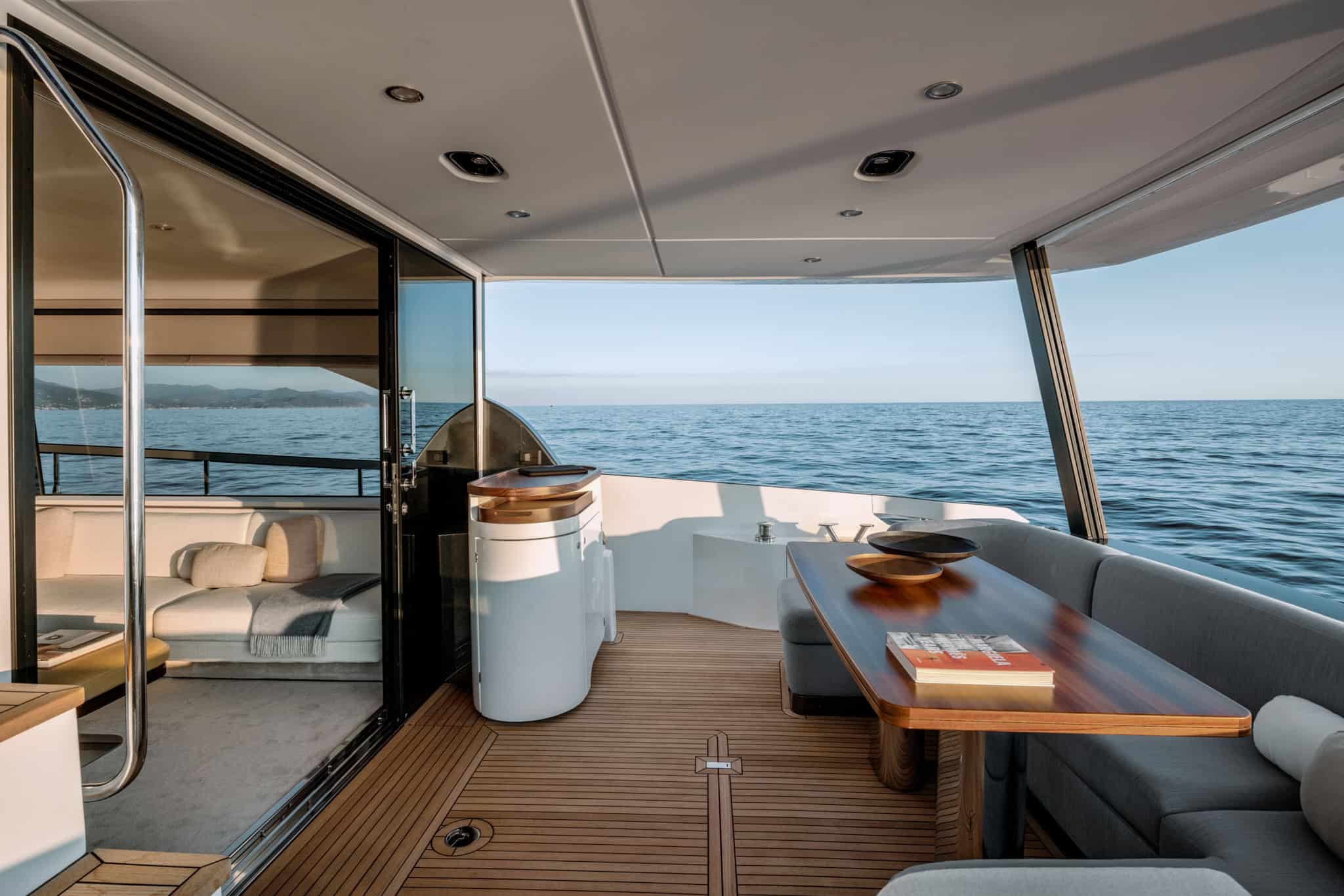 Azimut Fly 68 – Pangea offers three well appointed guest cabins, including a spacious master suite, a VIP cabin, and a twin cabin, all designed for comfort and privacy. The crew cabin is discreetly positioned to ensure seamless service without disrupting guest space.