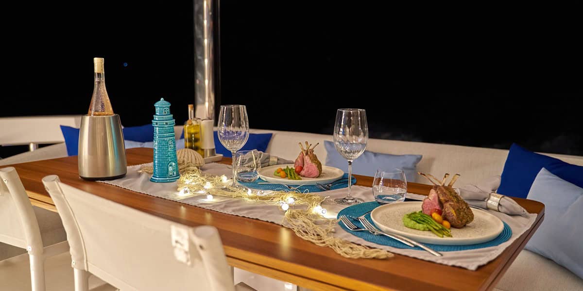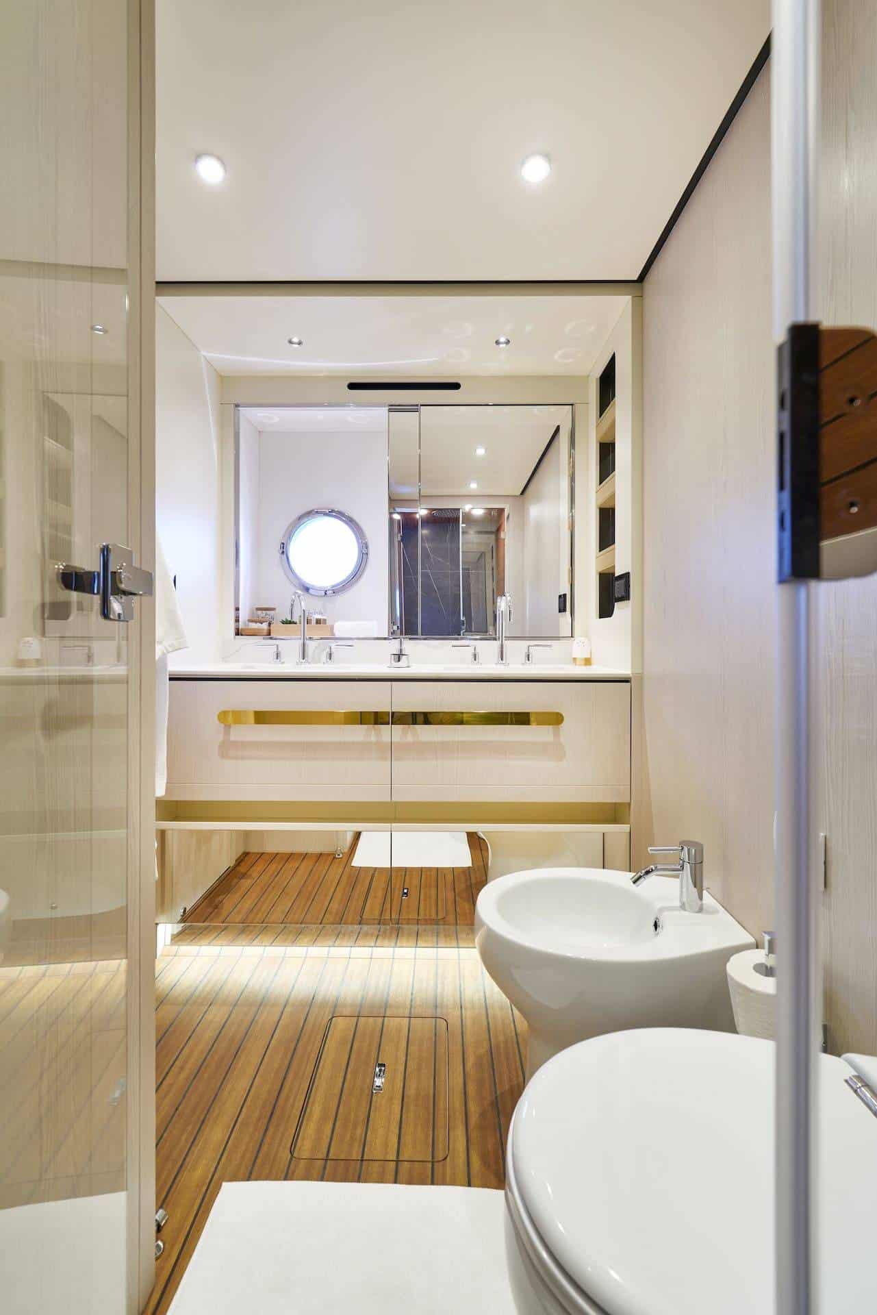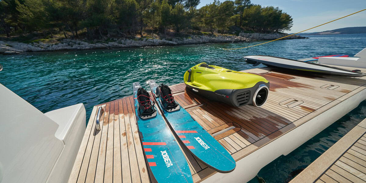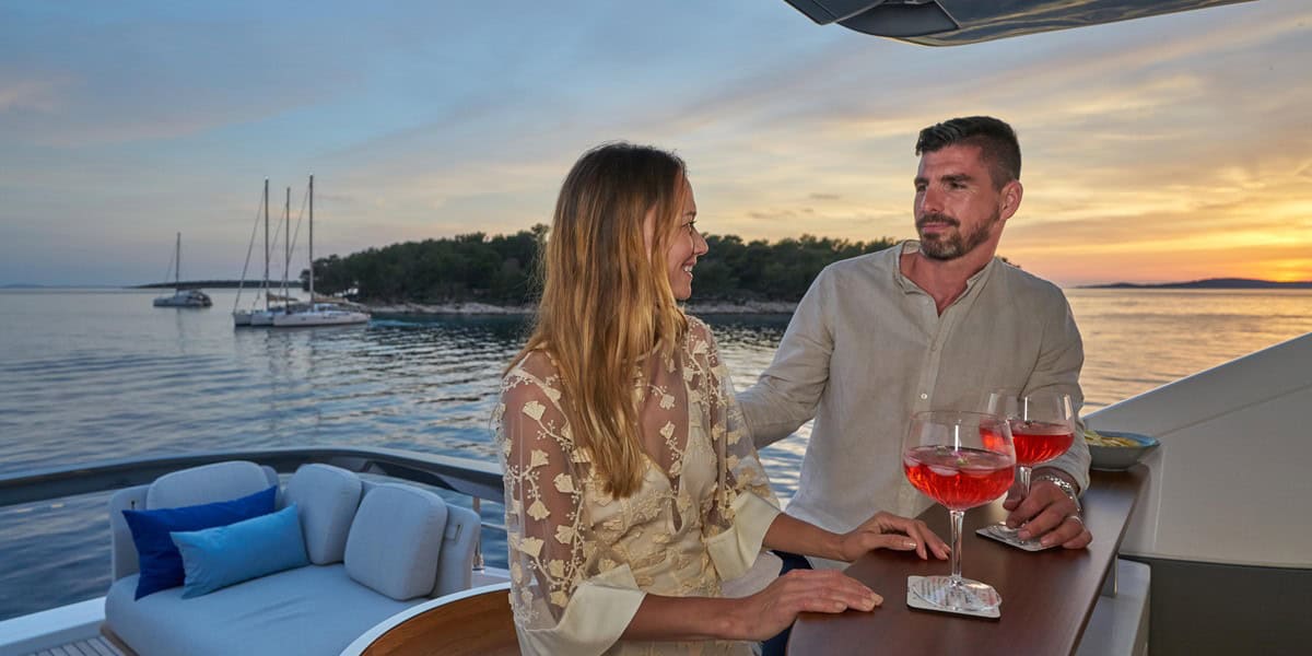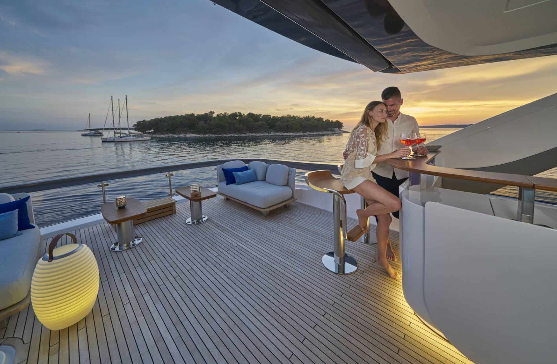 Her exterior design emphasizes outdoor living, with generous deck areas that invite guests to relax, dine, and take in sweeping sea views. The flybridge is a key highlight, featuring ample seating and sun lounging areas, ideal for socializing or enjoying long summer days on the Adriatic.