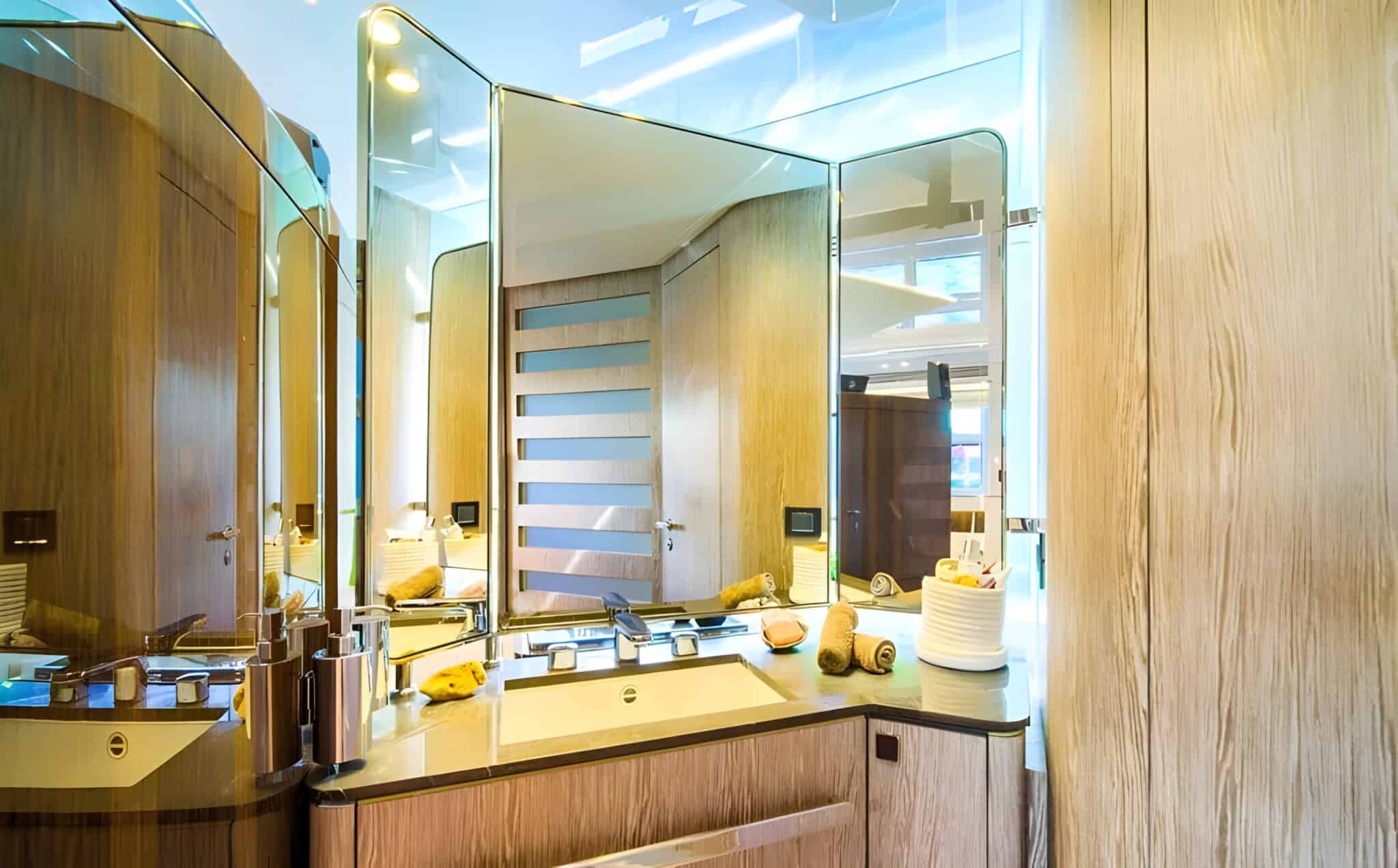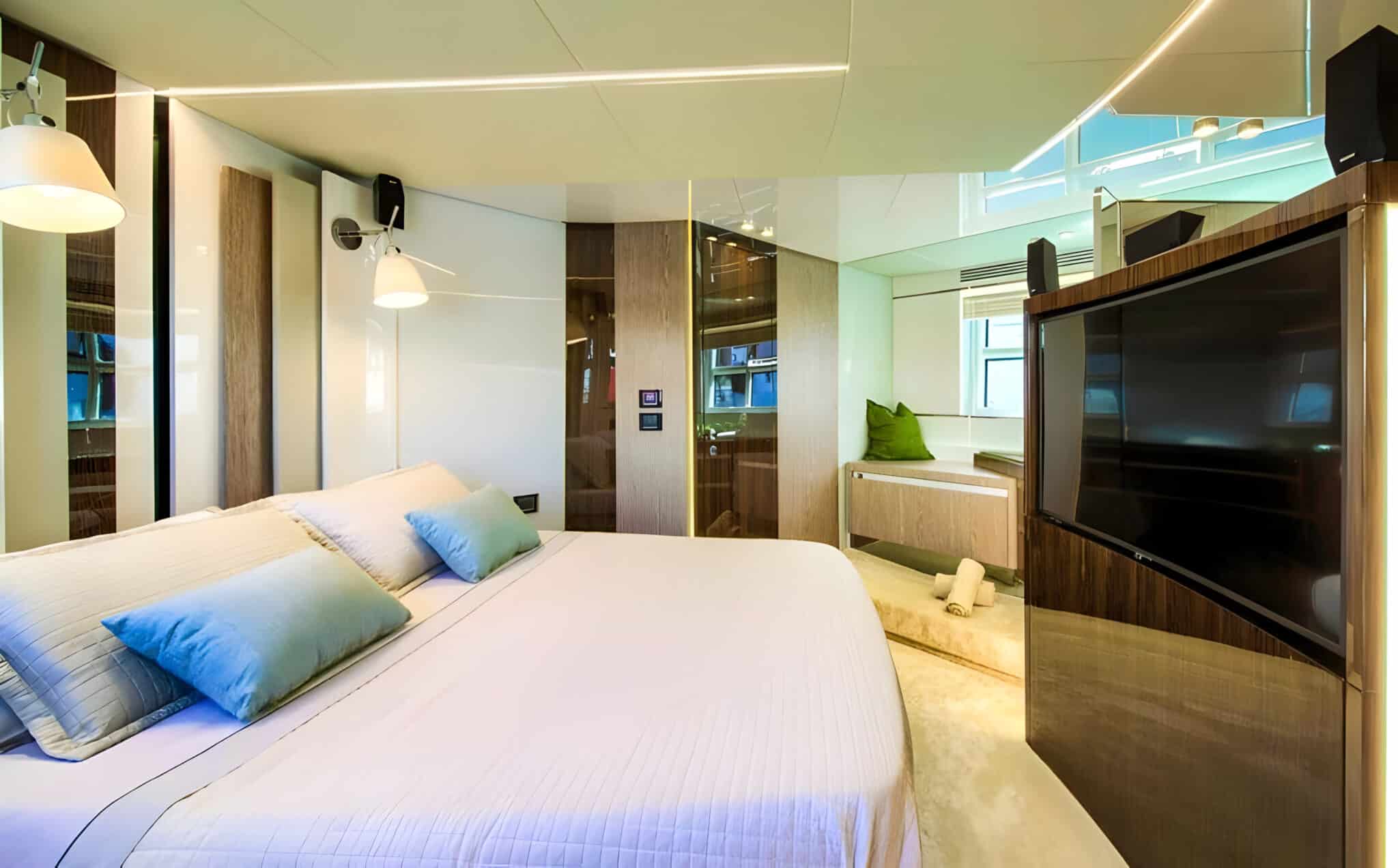 The S7 Mudita offers three beautifully designed guest cabins, including a full beam master suite, all with ensuite bathrooms. The interior is contemporary and elegant, featuring premium finishes, soft neutral tones, and abundant natural light.